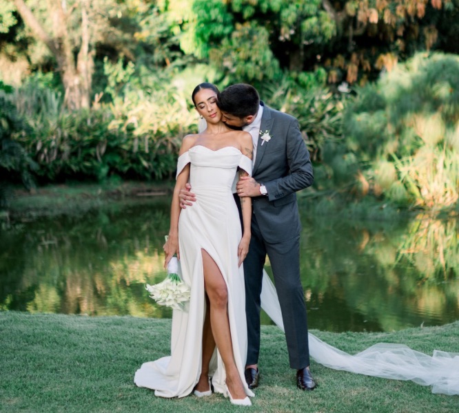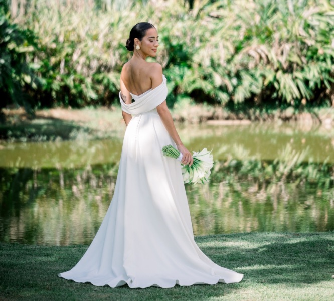 Descrição do vestido: Macacão em crepe Georgette com corpo trabalhado em renda de algodão.