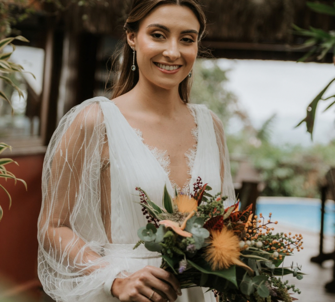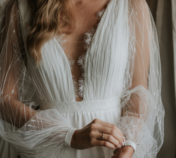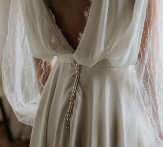 Vestido em tecido encorpado com bordado de linha e crepe fluido dando textura em detalhes.