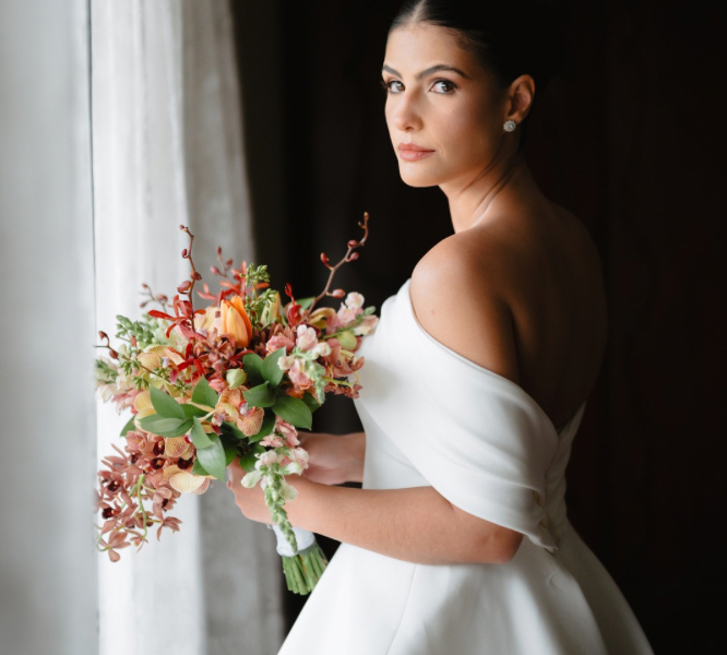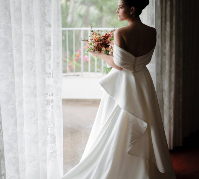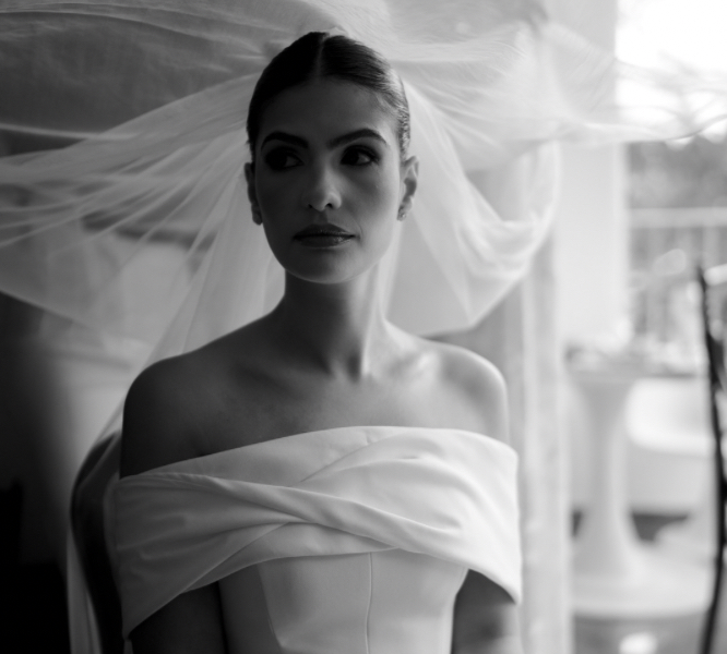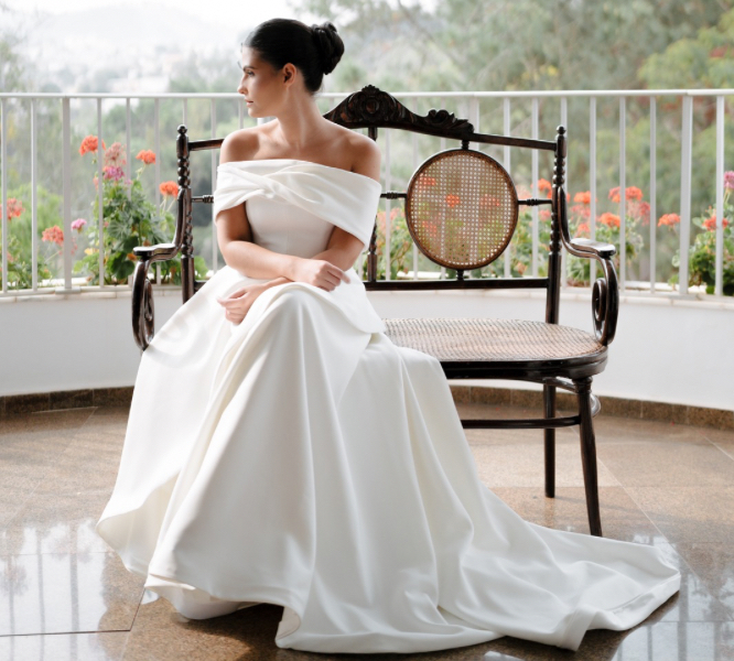 Descrição do vestido: O modelo é a pura elegância. Confeccionado em crepe de alfaiataria, sua pala drapeada, removível, destaca o colo de forma sofisticada. A saia com camada assimétrica e estruturada no crinol, complementa o visual com harmonia.