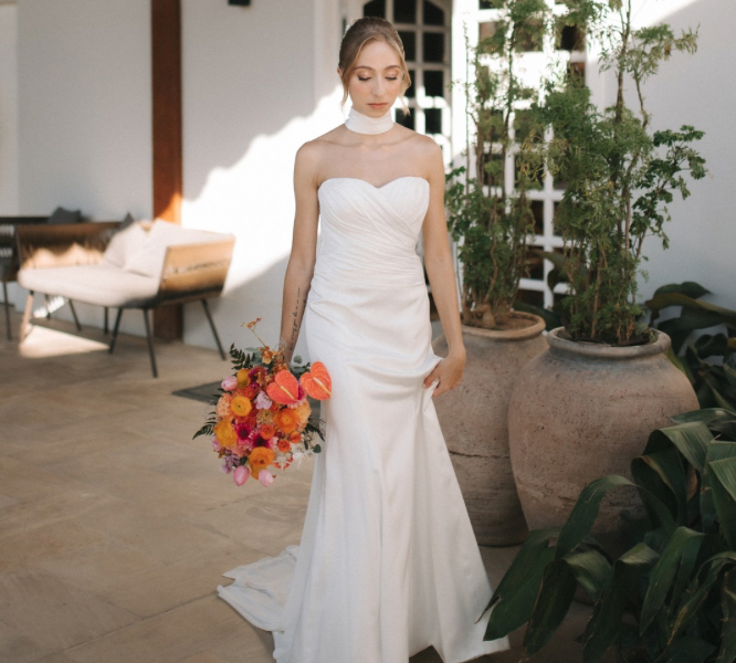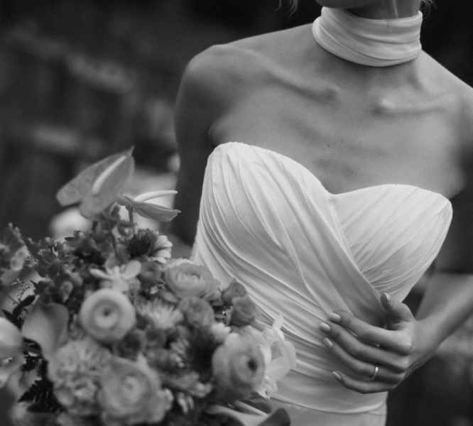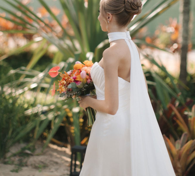 Descrição do vestido: Vestido no estilo minimalista com tecido levemente acetinado, trazendo elegância e modernidade ao look. Busto com drapeados feitos artesanalmente. Chocker com lenço bem fluido, deixando a composição bem leve e fluida.