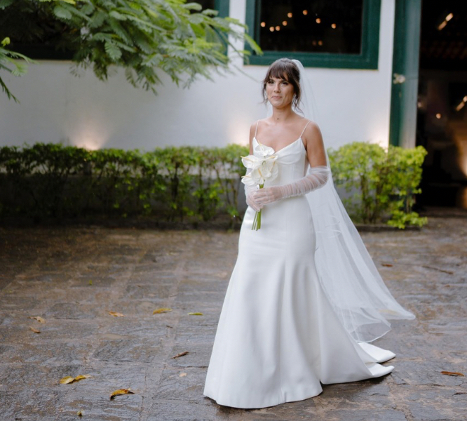 Descrição do vestido: Modelo todo em crepe London com corpete estruturado no estilo lingerie. Detalhe nas costas na transparência do crinol, trazendo um elemento adicional ao look. Saia no corte semi sereia que modela bem o início do quadril.