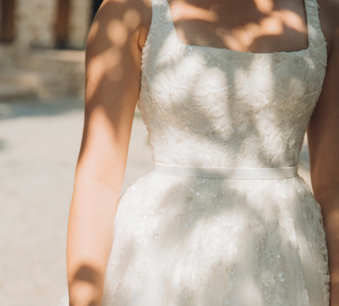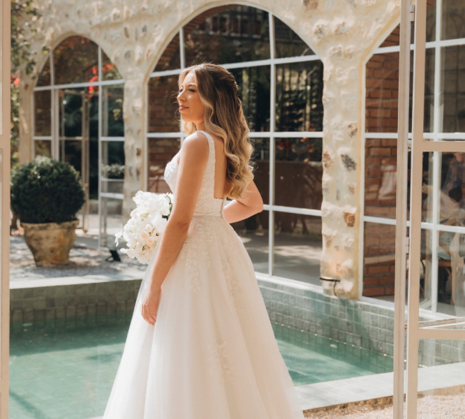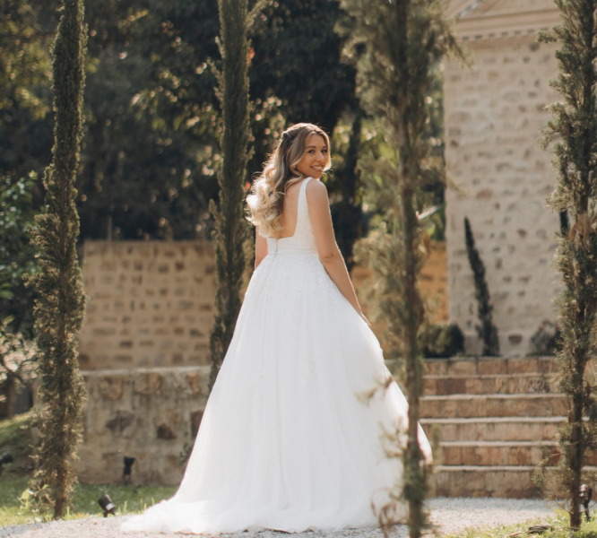 Descrição do vestido: Modelo todo em tule fluido de poá com aplicações de renda bordada. Decote quadrado e alças delicadas. Saia no corte bem godê, bem fluido oferencendo um movimento encantador e uma sensação de leveza.