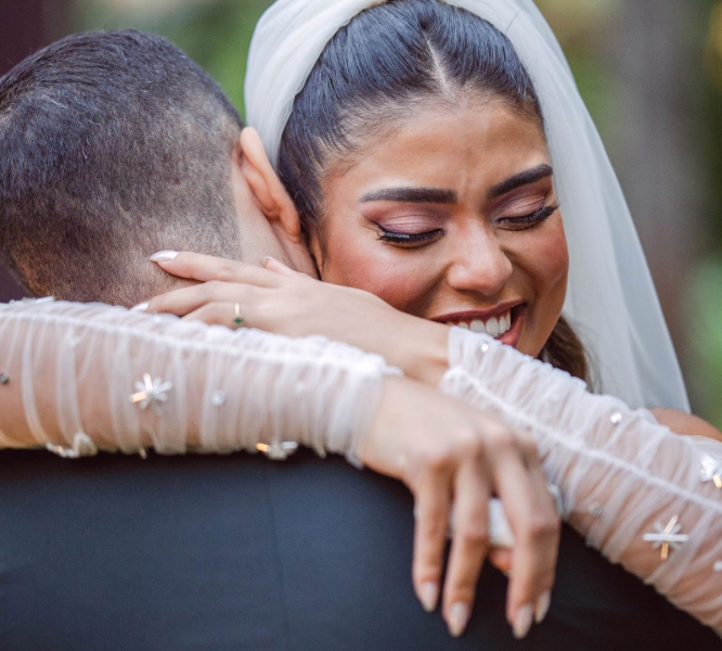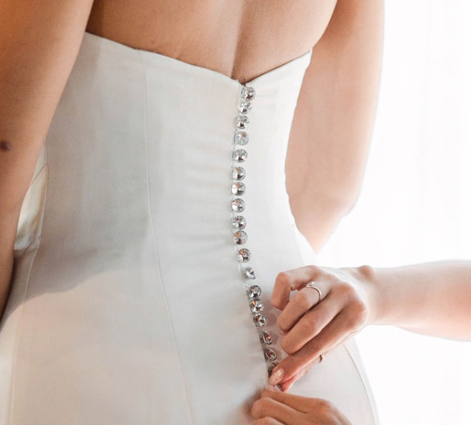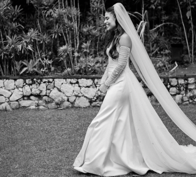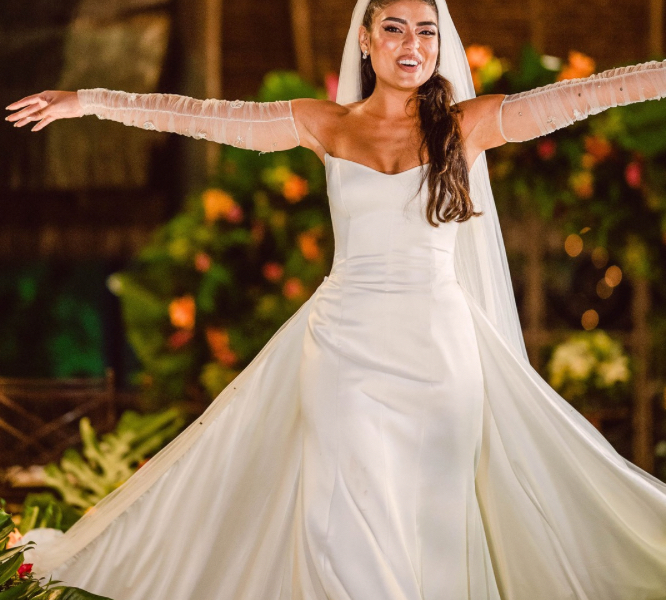 Descrição do vestido: O vestido é o arranjo perfeito de leveza e sensualidade. Com o corte semi sereia, revela a silhueta em crepe encorpado e o acabamento de botões em cristais Swarovski, detalhes que trazem autenticidade à peça. A cauda removível e as luvas bordadas à mão adicionam um charme particular ao visual.